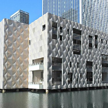 The Heron Quay pavilion impresses with a 3D aluminum facade that combines technology and nature. The innovative 2-layer surface coating creates a dazzling play of colors that changes depending on the time of day and the incidence of light. The multi-faceted elements reflect the waves of the Thames and create a fascinating 3D effect.