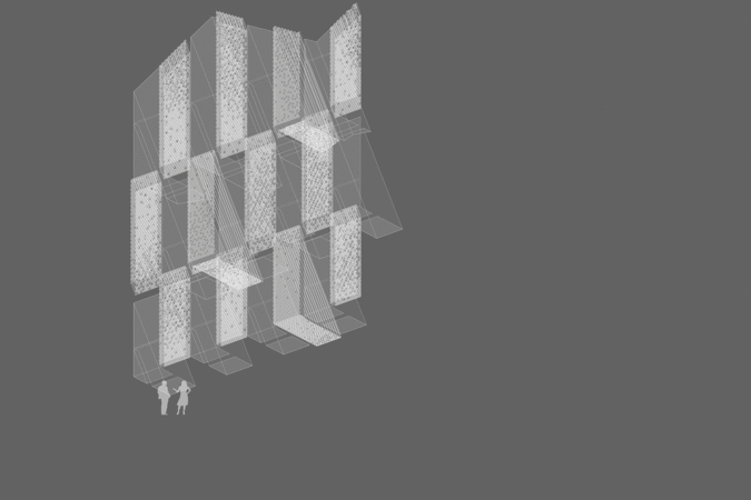 The entire structure is clad with perforated panels of anodized aluminium, which create an interesting lighting effect inside. The perforation pattern was designed to give the impression of light falling through a tree crown when light falls on it.