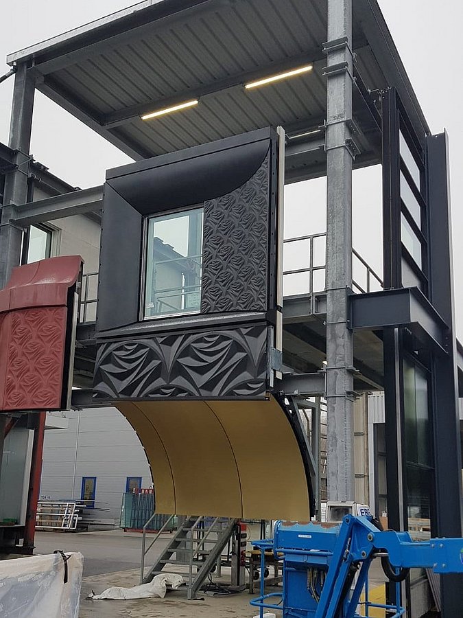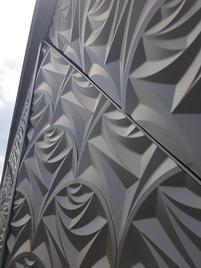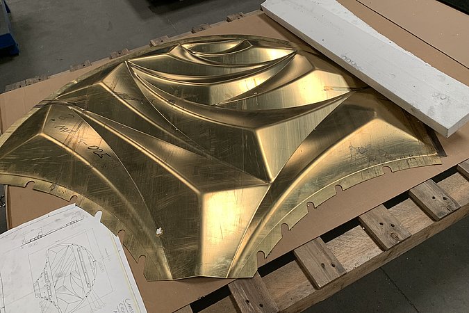 Für die Realisierung der markanten Fassade lieferten wir mehrere Schlüsselelemente: Unter anderem die elegant gebogenen Messingtafeln aus unserer naturfarbenen POHL Bronze. Hinzu kommen zahlreiche einzeln gefertigte, filigrane Rosenreliefs aus zweifach patiniertem Messing unserer POHL Bronze. Eine besondere Herausforderung lag darin, die Übergänge zwischen all diesen Elementen so präzise auszuführen, dass trotz der komplexen Geometrie und des lebendigen Reliefs ein optisch nahtloses Gesamtbild entsteht. Ergänzend fertigten wir die Rosenrelief Fassade der oberen beiden Etagen aus pulverbeschichtetem Stahl als wirtschaftliche Value-Engineering-Lösung. Auf der Rückseite des Hauses befinden sich außerdem maßgefertigte Louver mit Custom-Perforation ebenfalls aus zweifach patiniertem Messing, die als Lüftungsgitter und Abdeckung dienen.