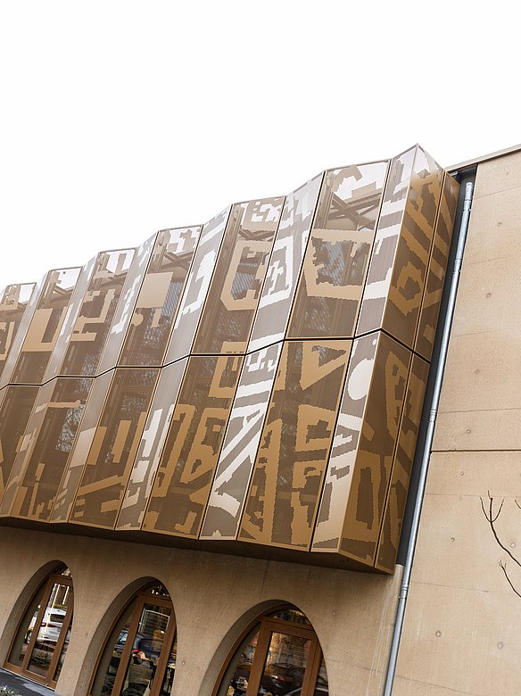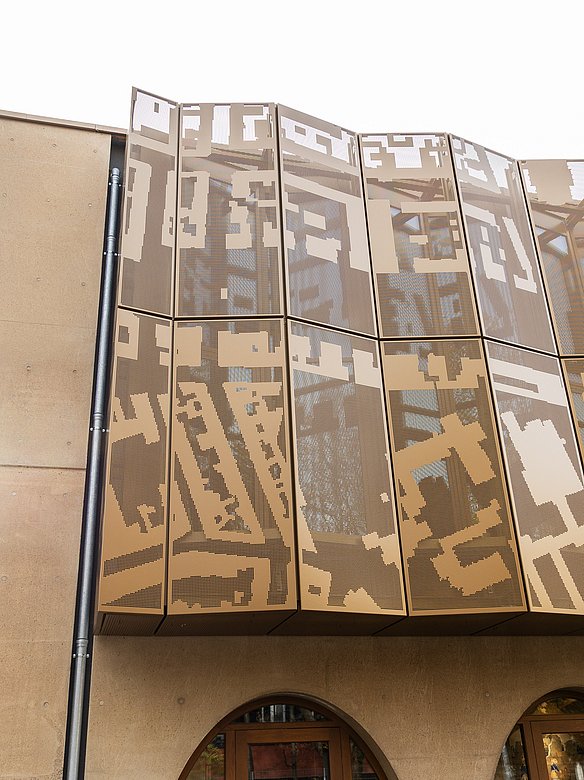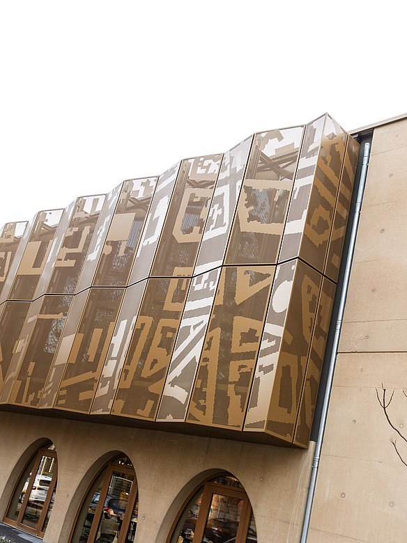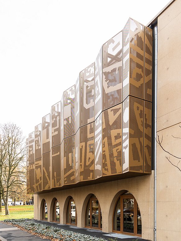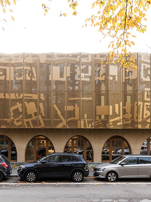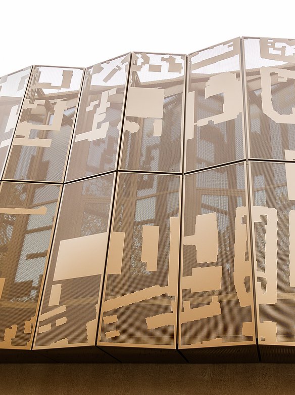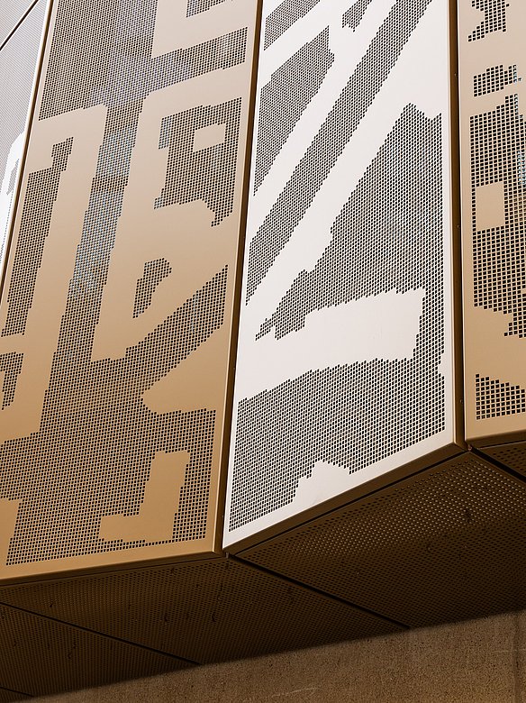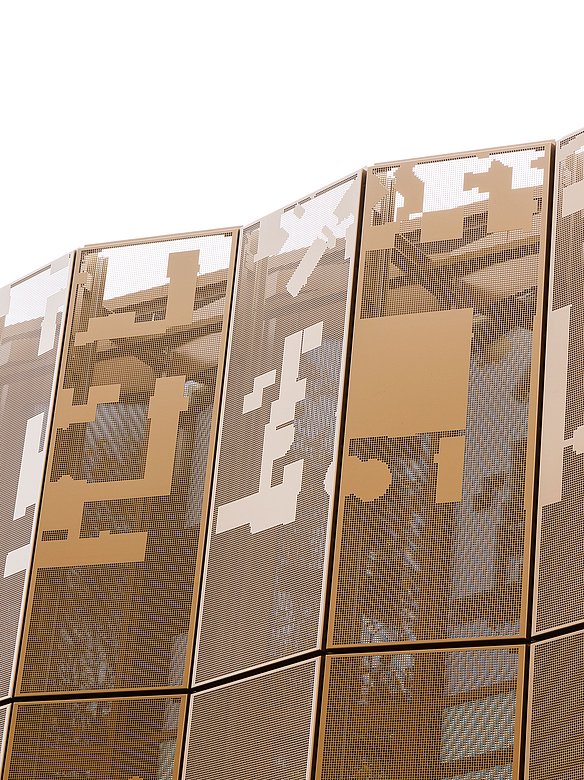 Finished with a gold powder coating and realized using the POHL Europanel system, the facade not only creates an architectural highlight on the exterior. Thanks to the perforation, it also fills the interior with bright, natural light, resulting in warm and welcoming spaces.