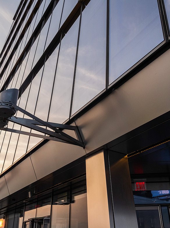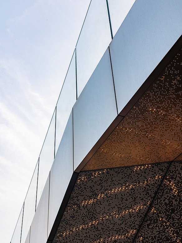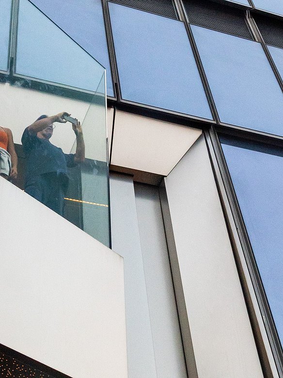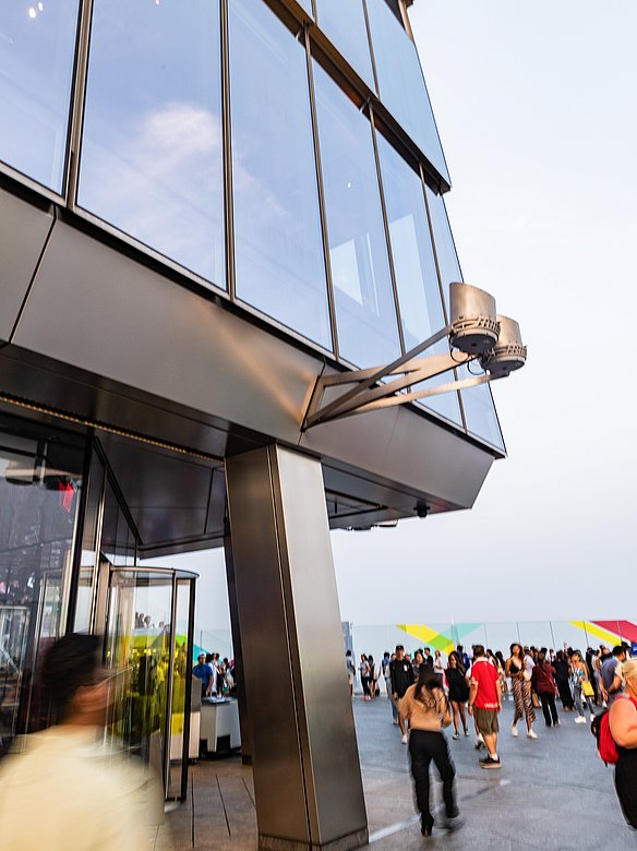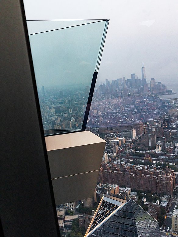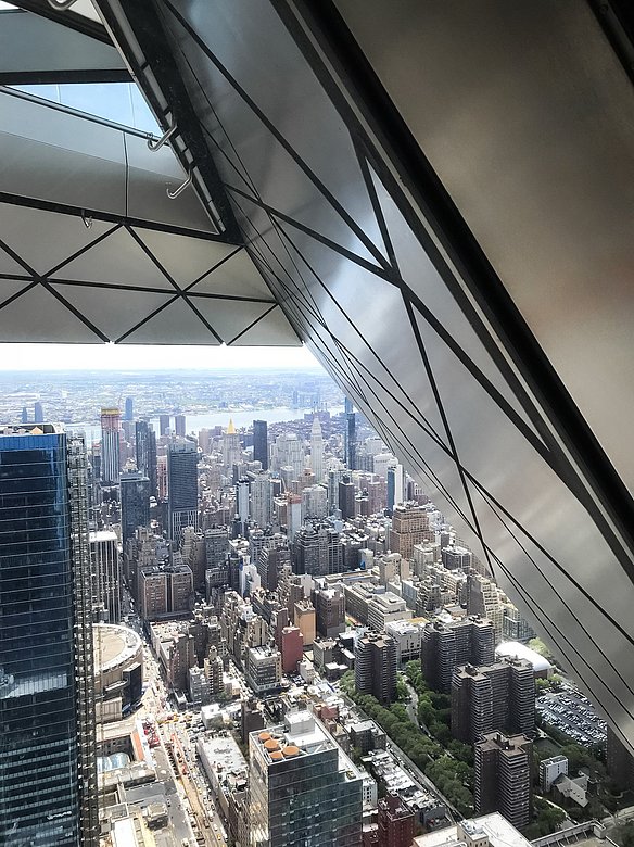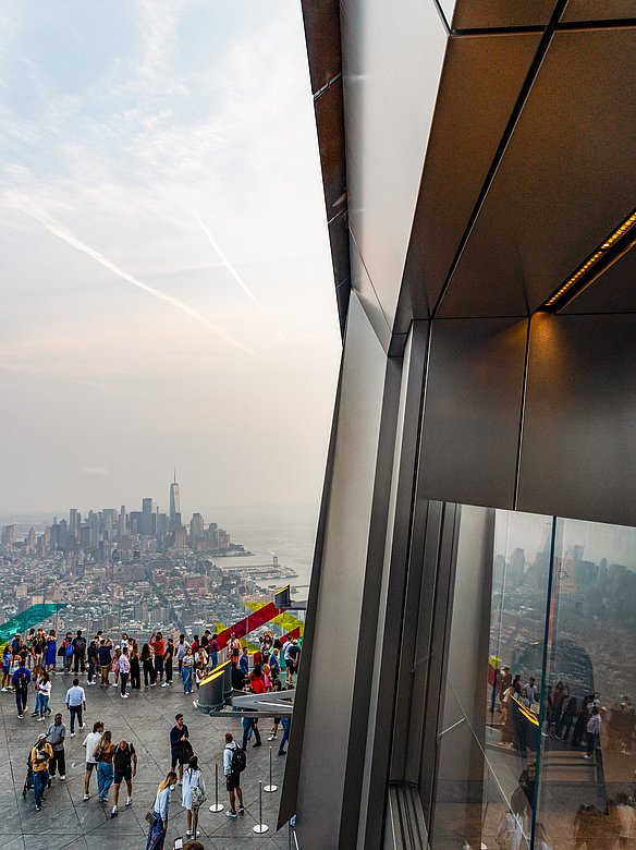 The "Edge" viewing platform in New York offers breathtaking views from a height of 335 meters above the rooftops of Manhattan. The triangular platform is clad all around with stainless steel panels with a POHL Linen finish. A special highlight are the perforated panels under the stairs, which create fascinating, shimmering light effects, especially at sunset. The entire underside of the platform is designed with triangular elements that artfully reflect the shape of the platform.