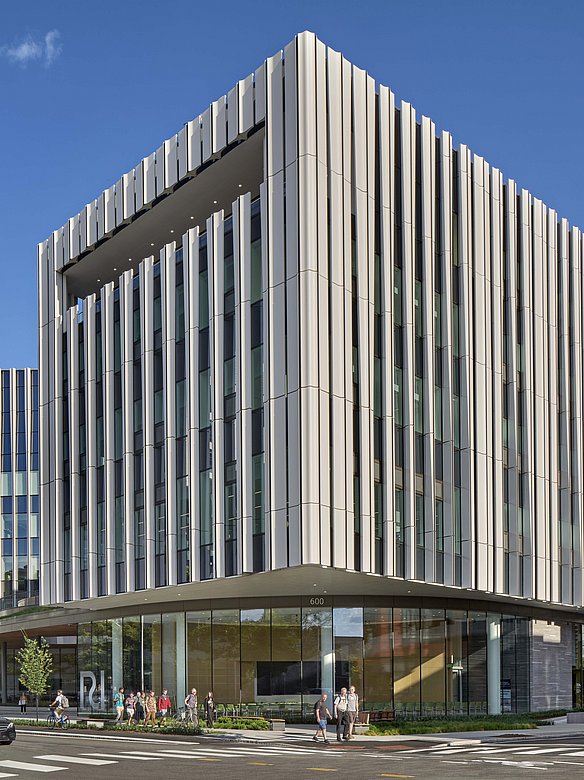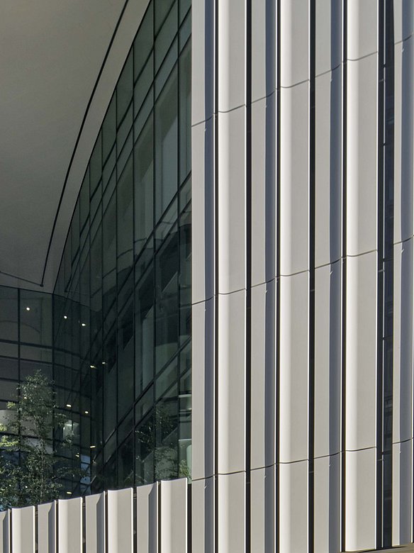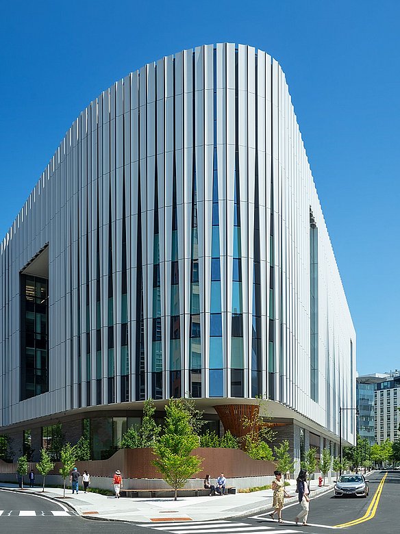 The new research center of the Ragon Institute in Boston was opened in 2025. An organically shaped building rises up on a 6,280 m² triangular site, its curved lines deliberately creating a contrast to the often angular neighboring buildings. Vertically arranged, individually shaped sunshades made of powder-coated aluminum frame the floor-to-ceiling window openings. The "POHL Tile" surface, specially developed by POHL, imitates classic stone masonry, but offers all the advantages of aluminum - lightness, formability and durability.