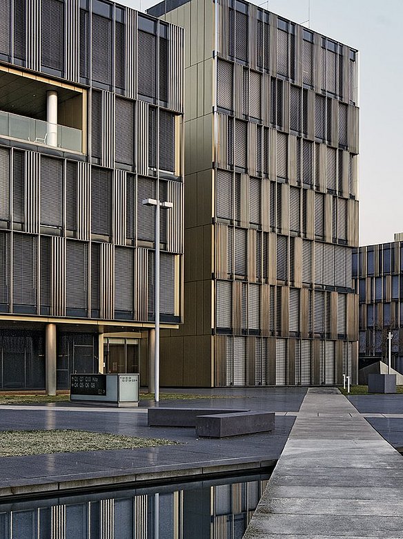 The ThyssenKrupp Quarter in Essen impresses with a striking façade design made of high-quality stainless steel. The campus, which includes the new ThyssenKrupp headquarters and other office and administration buildings of the Group, is characterized by gold-colored, powder-coated facade elements from POHL, among other things. This sophisticated design, in combination with the exposed location of the quarter, makes the ensemble stand out clearly from its surroundings.
