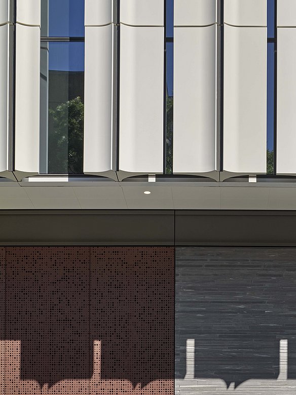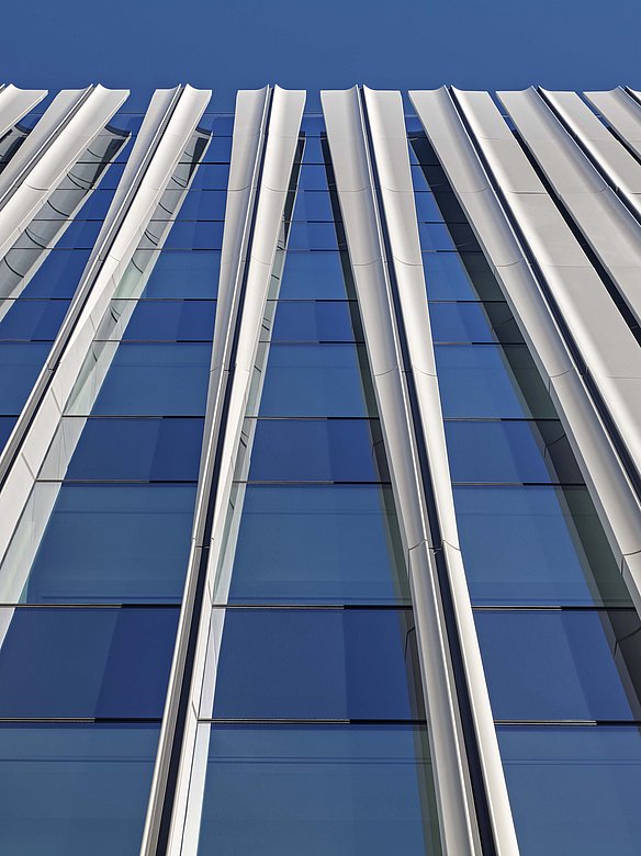 The materiality of the building is inspired by the institutional character and tradition of limestone. However, due to its numerous advantages, the sunshade elements were made from powder-coated aluminum. POHL developed POHL Tile, a special surface that perfectly mimics the appearance of a stone facade while combining all the physical properties of aluminum. This solution is significantly lighter, durable, and more formable than stone, allowing for large-format implementations.