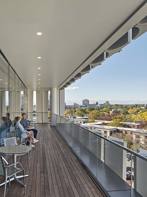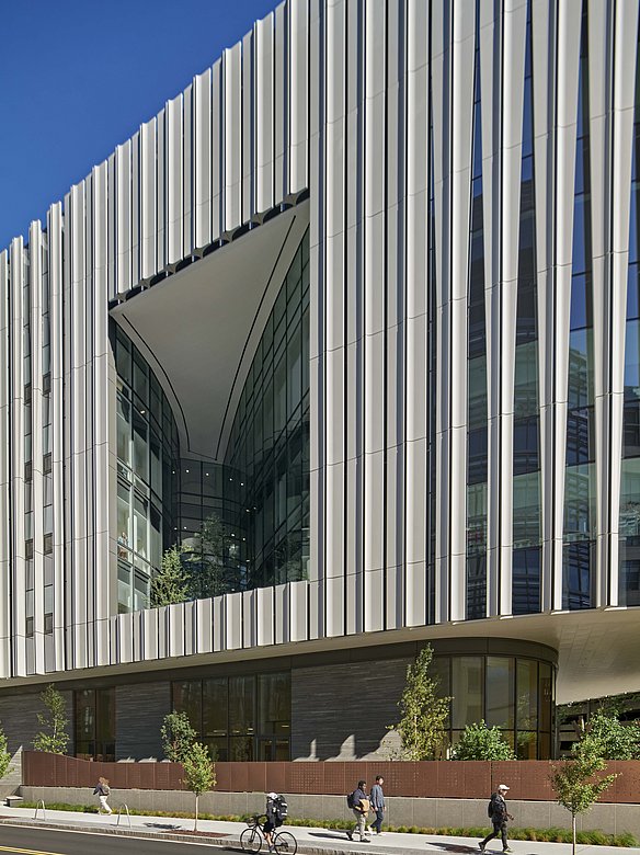 The building concept incorporates the unusual shape of the plot and integrates it harmoniously into the architecture. With its organic forms and elegantly curved design, the Ragon Institute stands out from the often angular architecture of the surrounding area. The minimalist facade is characterized by vertically oriented, individually shaped sunshades that taper or open in response to the interior program, creating a dynamic appearance.
