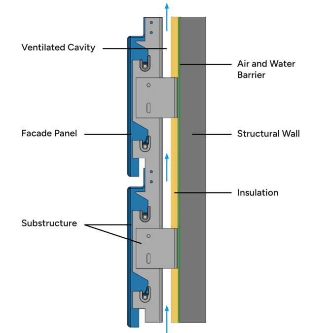 The functionality of a rainscreen facade is based on the clear separation of weather protection and thermal insulation. The outer metal panels provide a durable shield against rain, wind, and solar exposure. Any moisture or condensation that enters the assembly is effectively drying-off by the airflow in the ventilated cavity, ensuring that the insulation remains dry and maintains its full performance over time. Ventilated facade systems create a stable indoor environment, prevent structural damage, and enhance the building’s overall energy efficiency.