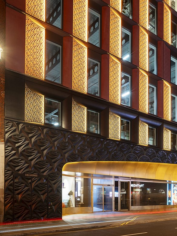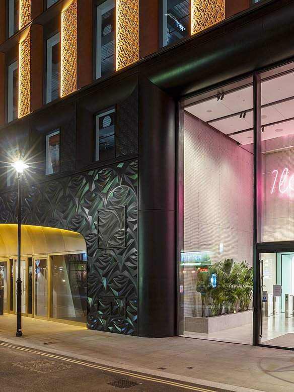 Die kunstvoll gestaltete Fassade ist ein zentrales Gestaltungselement des Ilona Rose House. Mit detailreichen Rosenmotiven aus POHL Bronze patinierten Messing, unserem pulverbeschichteten Stahl und GRC greift sie die künstlerische Tradition Sohos auf und interpretiert sie zeitgenössisch. Je nach Lichteinfall entfaltet die Oberfläche eine lebendige Dynamik, von warm glänzendem Messing bei Sonnenschein bis zu einer zurückhaltend eleganten Anmutung bei bedecktem Himmel, und macht das Gebäude zu einem charakterstarken Teil des Stadtbilds.