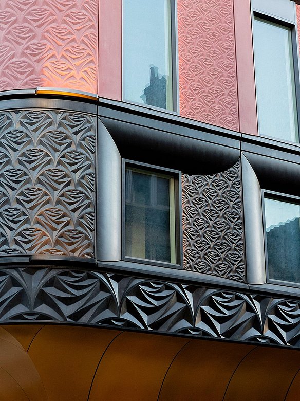 Für die Realisierung der markanten Fassade lieferten wir mehrere Schlüsselelemente: Unter anderem die elegant gebogenen Messingtafeln aus unserer naturfarbenen POHL Bronze. Hinzu kommen zahlreiche einzeln gefertigte, filigrane Rosenreliefs aus zweifach patiniertem Messing unserer POHL Bronze. Eine besondere Herausforderung lag darin, die Übergänge zwischen all diesen Elementen so präzise auszuführen, dass trotz der komplexen Geometrie und des lebendigen Reliefs ein optisch nahtloses Gesamtbild entsteht. Ergänzend fertigten wir die Rosenrelief Fassade der oberen beiden Etagen aus pulverbeschichtetem Stahl als wirtschaftliche Value-Engineering-Lösung. Auf der Rückseite des Hauses befinden sich außerdem maßgefertigte Louver mit Custom-Perforation ebenfalls aus zweifach patiniertem Messing, die als Lüftungsgitter und Abdeckung dienen.