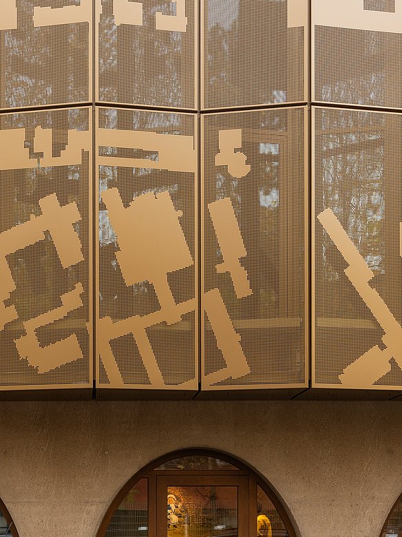 Mit einer goldenen Pulverbeschichtung und realisiert mit dem POHL Europanel System setzt die Fassade nicht nur außen ein architektonisches Highlight. Dank der Perforation entstehen auch im Inneren helle, lichtdurchflutete Räume, die eine einladende Atmosphäre schaffen.