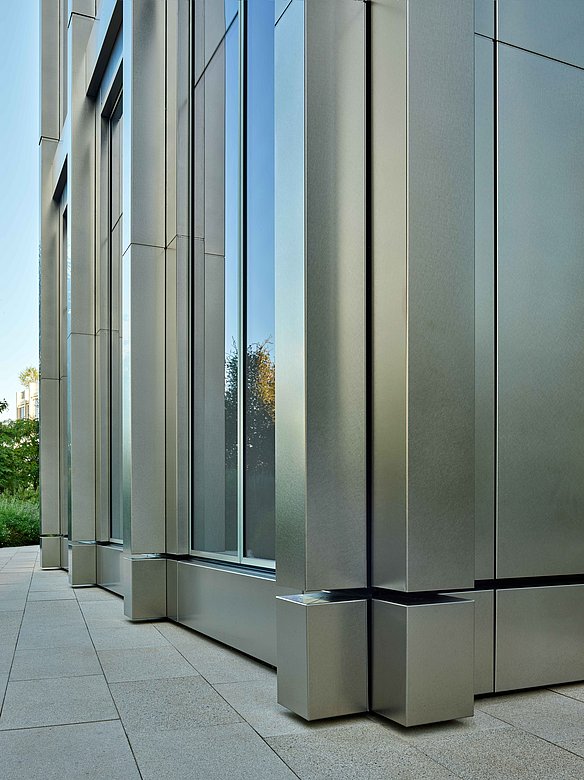 Die dem Studiogelände zugewandte Seite zollt Hollywoods goldener Ära mit einer Metallfassade aus natürlichem Edelstahl Tribut. POHL lieferte die großen, individuell geformten Metallelemente im typischen Gehry-Stil, die sich über die gesamte Geschosshöhe erstrecken. Die Oberfläche mit Vibration Finish reduziert den Glanz, aber ermöglicht eine hohe Reflexion ohne direkte Spiegelung.