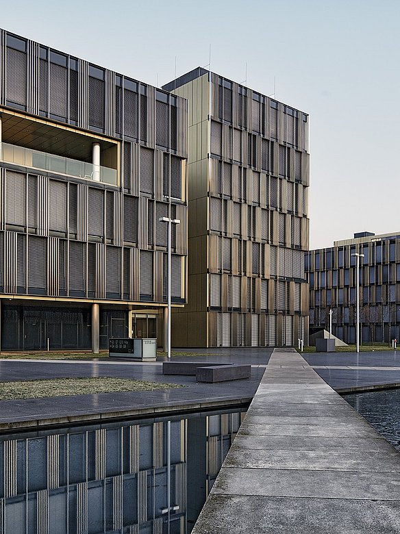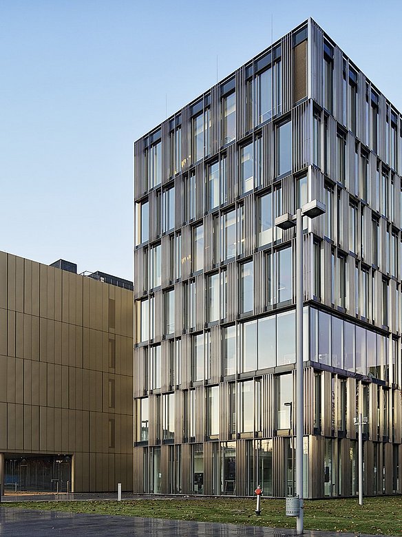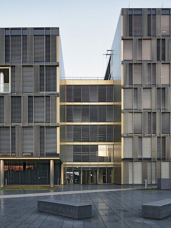 Das ThyssenKrupp Quartier in Essen beeindruckt mit einer markanten Fassadengestaltung aus hochwertigem Edelstahl. Der Campus, der die neuen Headquarters von ThyssenKrupp sowie weitere Büro- und Verwaltungsgebäude des Konzerns umfasst, zeichnet sich unter anderem durch goldfarbenen, pulverbeschichtete Fassadenelemente von POHL aus. Dieses durchdachte Design, in Kombination mit der exponierten Lage des Quartiers, lässt das Ensemble deutlich aus seiner Umgebung hervortreten.