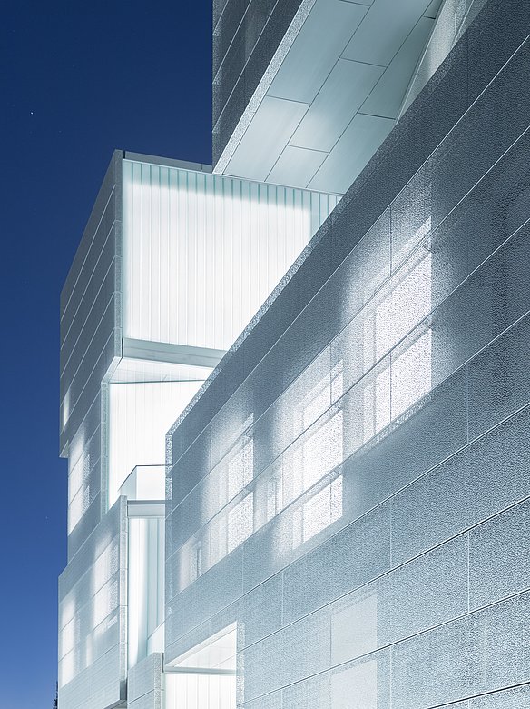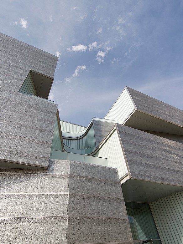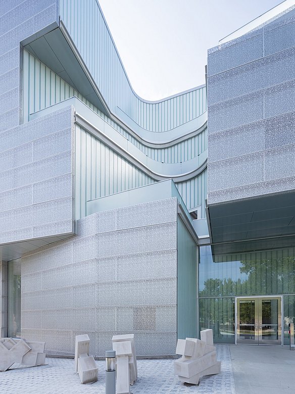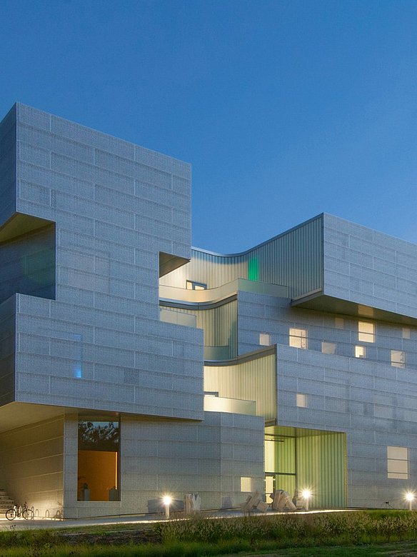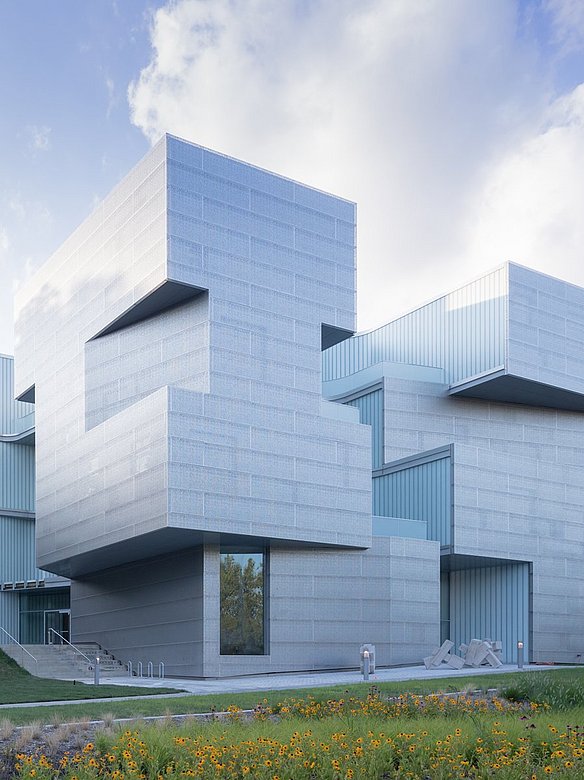 Das vierstöckige Visual Arts Building der University of Iowa wurde mit einer neuen Zink-und perforierten Edelstahlfassade verkleidet. Dieses innovative Gebäude, entworfen vom renommierten Architekturbüro Steven Holl Architects, beeindruckt durch seine außergewöhnliche Formgebung und Funktionalität. Geschickt platzierte Einschnitte und Öffnungen in der Gebäudehülle lenken natürliches Licht tief ins Innere. Diese durchdachte Gestaltung schafft nicht nur eine inspirierende Atmosphäre, sondern verleiht dem Gebäude auch seinen einzigartigen Charakter.